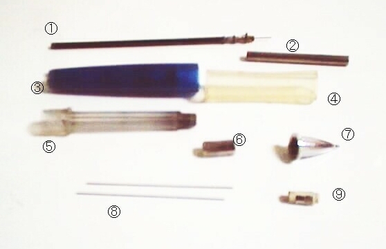 G…芯である。これがなければ文字を書く事はできない。鉛筆の芯と同じ素材でできている。こんなものをこれほどまでに(ここでは0.5mm)細く削りだす日本の技術には脱帽する。