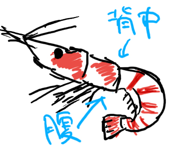 海老の体ってどの部分が腹でどの部分が背中なのか。というと、大概の人は下の図のような答えになるのではないか。僕もそう思う。