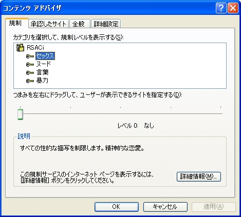 コンテンツアドバイザを有効にする、というボタンがあったので何かと思い押してみたらこんなウィンドウが。